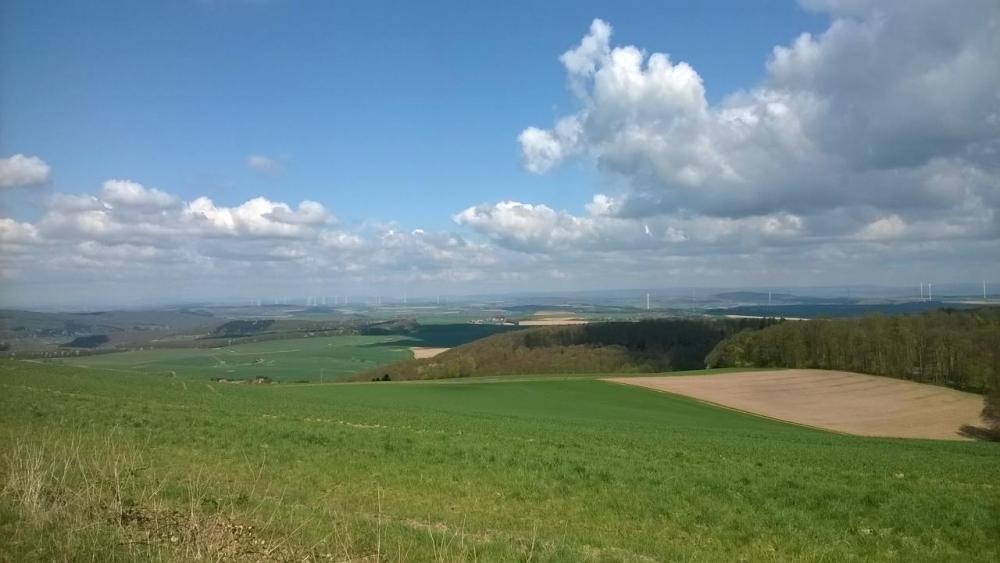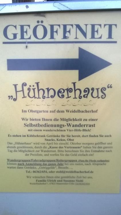 Am vergangenen Wochenende musste ich mal "dringend raus". Ein Freund und mein Hausarzt hatten mir quasi etwas Abwechslung verordnet. Da die Entscheidung sehr kurzfristig fiel, war für lange Planungen keine Zeit. Ein Overnighter auf dem nur 8km entfernten Teilstück des Pfälzer Höhenweges sollte es werden. Also ab in den Ausrüstungskeller und die Go-Box in den Jam 35 gekippt: MYOG Jardine QuiltMYOG Gleitschirm-Nylon Tarp 1,5x3m (am Freitag Abend um 22:00h noch schnell mit heißer Nadel zusammengeschneidert)TAR RidgerestLaufbursche Titanheringe99g Esbit-KochsetRegenzeuglange U-Hose, Buff, Handschuhe, Fernweh-MützeRamen-Nudeln im Ziplock, Komet Schokopudding als NachspeiseSawyer Mini, Platyund ganz wenig KleinkramMeine beste Hälfte hatte uns um 09:30h am Bastenhaus rausgeworfen. Erstes Ziel war Ruppertsecken, das höchste Dorf der Pfalz. Ruppertsecken - der Blick reicht weit. Danach führt der Weg bergab durch Würzweiler nach Rockenhausen. Die Wegführung ist durchweg super beschildert, die Karte diente nur zur Beantwortung der "wie weit ist es nach..:"-Fragen. Verlaufen ist eigentlich nicht möglich. In Rockenhausen werden Samstag Nachmittags zeitig die Bürgersteige hochgeklappt. Einzig im Rewe gabs leckere Mettbrötchen. Bei der anschließenden Mittagsrast hat sich zum ersten Mal die Riderest bewährt. Aufgrund des üppigen Packmaßes außen am Jam befestigt, war sie als Pausenmatte schnell zur Hand. Der Weg aus Rockenhausen hinaus ist steil. Umso ärgerlicher ist, dass man nach ca 2/3 des Gesamtanstieges wieder nach Katzenbach hinab geführt wird, nur um sich dort die sehr unspektakulären Überreste eines Römoschen Gutshofes anzuschauen. Für Neugierige: Etwa 20cm hohe Mauerreste auf einer grünen Wiese. Das Durchlesen der Hinweistafel dauert länger als die Besichtigung der "Ausgrabungen". Die soeben hergeschenkten Höhenmeter darf man nach erfolgtem Kulturgenuss natürlich wieder einsammeln, und noch einige mehr. Habe ich erwähnt, dass die Gegend Nordpfälzer Bergland genannt wird ? Auf der Höhe angekommen hieß es bei recht frischem Wind Strecke machen. Die Aussichten links und rechts des Weges reichen weit. Am späten Nachmittag ist Zeit für eine Kaffepause. Nachdem die Wasservorräte samt in Kaffee umgesetzt waren, musste Nachschub her, zumal der Tag zu Ende ging. Meine Begleitung hatte die Kaffepause genutzt um den Komfort der Ridgerest zu testen - nach ca. einer Stunde (Nach-)Mittagsschlaf musste ich ihn wecken . Die nächste Aufgabe war also Wassernachschub. Das sollte kein Problem werden, da nur ein paar Meter weiter laut Karte eine Quelle direct am Weg liegen sollte. Die Quelle war da, allerdings nicht viel mehr als ein Schlammloch im Wald. Da ich nicht wie Kai Sackmann den Waldboden auf der Suche nach Wasser survivalmäßig umgraben wollte, war kurzerhand eine Alternative gefunden. Der Sawyer Mini tat seinen Dienst und weiter gings. Manchmal gibt es tolle Zufälle unterwegs. Ein außenliegendes Gehöft, welches ich eigentlich auf der Suche nach einem geeigneten Übernachtungsplatz meiden wollte, entpuppte sich als echtes Wandererparadis: "Natürlich" liefen wir dem Bauern direkt in die Arme, und mit kurzem Blick auf die Ridgerest am Pack waren unsere Absichten klar. Kurz: Neben der Erlaubnis auf der Wiese neben dem Hühnerhaus unsere Tarps aufzuschlagen, gabs es noch eine Flasche Riesling und eine Flasche Portugieser Weißherbst - denn natürlich war die Gattin auch Winzermeisterin .