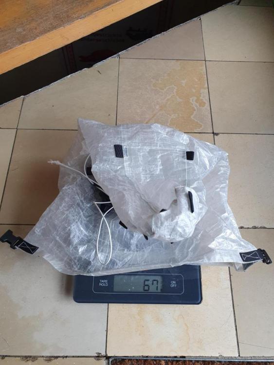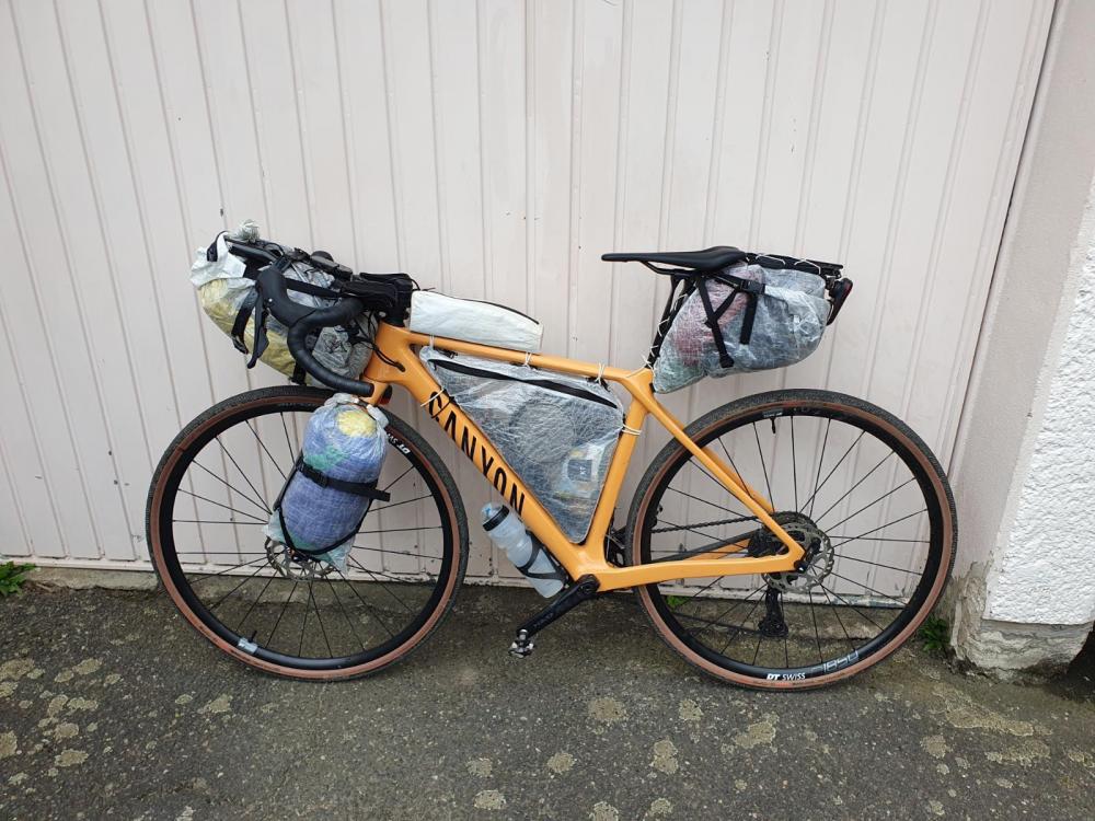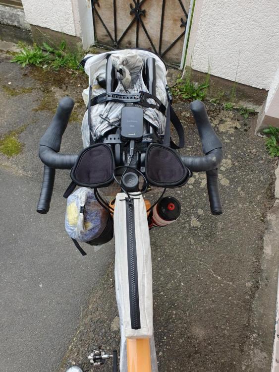 hi, ich habe ein paar Bikepackingtaschen genäht. Die Lenkertasche ist einfach ein alter DIY DFC Rucksack mit Ski Straps an den Auflieger gezurrt. Davor hängt einfach eine selbstgenähte Bauchtasche aus Ultra 200. Habe das noch nicht so getestet, aber die Idee ist, dass ich da einfach zugängliche Sachen reintun kann. In der Lenkertasche sind Zelt, Quilt und Isomatte. Für die linke Gabel habe ich einen Harness für einen DCF Packsack gebastelt. Der Harness ist aus PEHD (verstärkt mit mehreren Lagen) und Gurtbändern. Gedacht ist das für Regensachen. Die Rahmentasche ist einfach ein vernähtes Dreieck mit einer inneren Versteifung aus PEHD, damit man es an die Flaschenhalteranschraubpunkte anschrauben kann. Die Tasche ist relativ gespannt im Rahmen, weshalb sie sich nicht so sehr ausbeult. Die Arschrakete (Satteltasche) ist genäht und anschließend abgeklebt. Mit dem Sway Bar wackelt sie gar nicht. Insgesamt habe ich sie ein bisschen zu kurz gemacht. Die Oberrohrtasche ist aus Ultra 200 und einem Aquaguard 5VS. Den Reißverschluss finde ich sehr schön. Innen ist ein Gerippe aus PEHD zur Versteifung. Ich habe vor, damit zum Nordkap zu fahren und insgesamt bin ich ganz zufrieden mit dem Resultat. Hätte das Rad eine Halterung für einen Gepäckträger, hätte man das Gewicht besser verteilen können, sodass das Handling mit der Lenkung nicht so leidet.