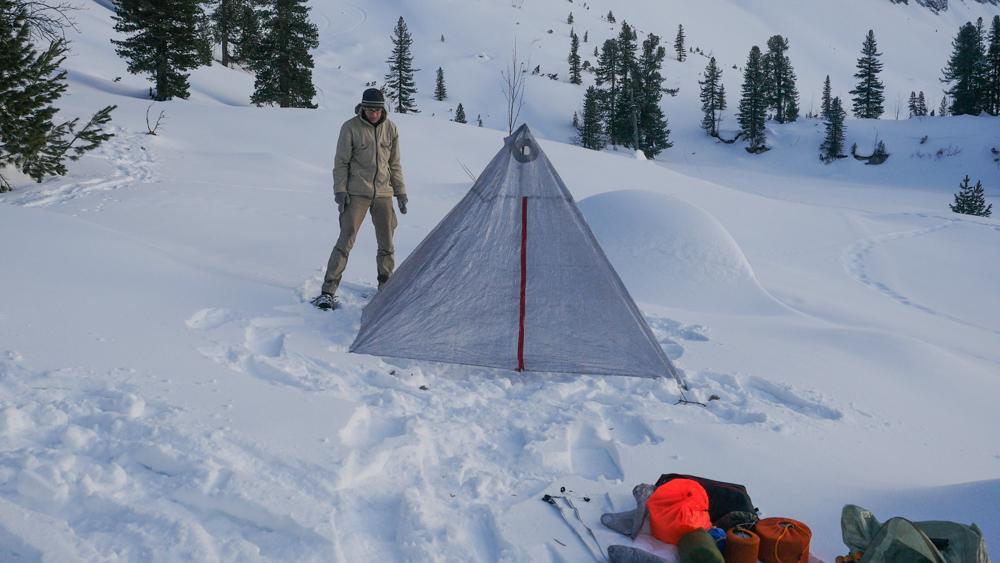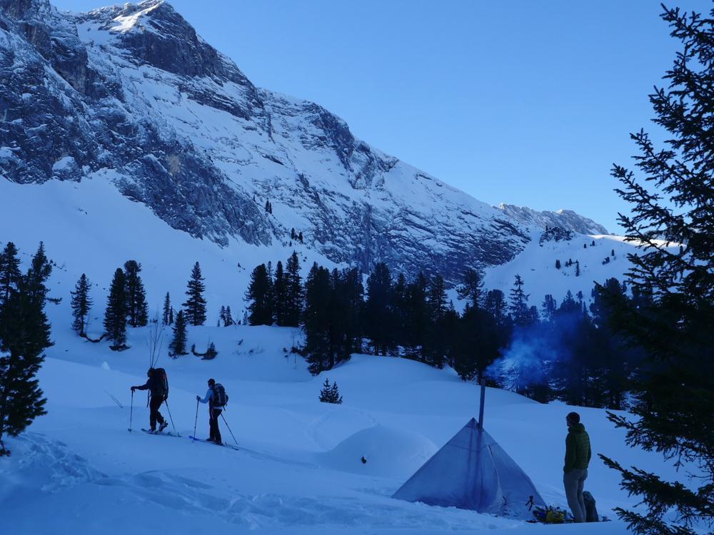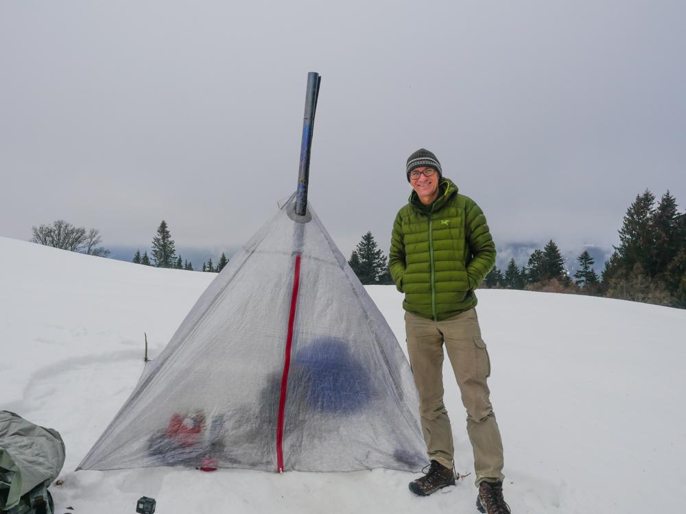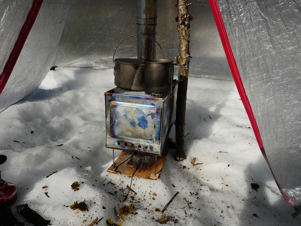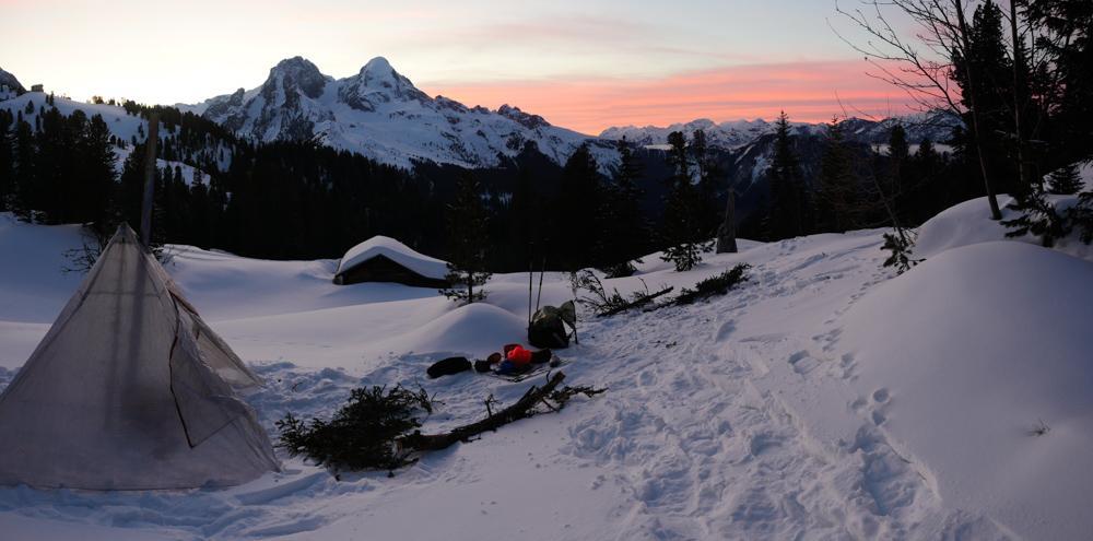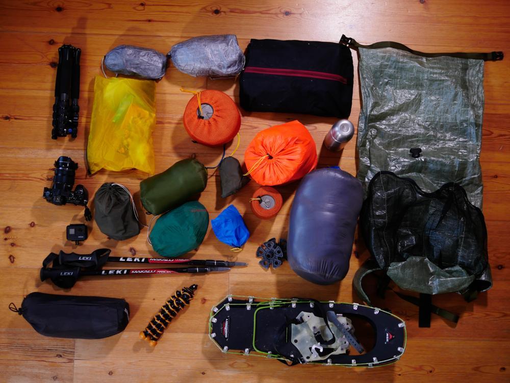 Ich habe mir am letzten Wochenende einen lange gehegten Traum erfüllt und eine viertägige Tour durch die Alpen bis an die Baumgrenze unternommen, auf der ich mit Rucksack und Schneeschuhen völlig autark unterwegs war. Dieses Projekt möchte ich hier in mehreren Teilen vorstellen. Beginnen wir mit der Ausrüstung Mir war von vornherein klar, dass ich bei dem geplanten Unterfangen streng genommen nicht im UL-Gewichtsbereich würde bleiben können, aber mehr als 15 kg sollten es nicht sein - und wurden es auch nicht. Mitgenommen habe ich (in Leserichtung zeilenweise aufgeführt): Ein Sirui-Carbon-Stativ (knapp 1 kg), ein DIY-DCF (Cuben Fiber) Tarp für meine Cross Hammock Querhängematte (118 g), ein DIY-DCF Hot Tent, soweit ich sehe das erste seiner Art (269 g), einen Titanium Wood-Stove von Seek-Outside, mit Klappsäge, stabilem Messer für Batoning und anderem Feuerequipment (2 kg), einen DIY-DCF-Rucksack von 42 Litern mit äußeren Netztaschen an drei Seiten (299 g), einen gelben Sack mit Lebensmitteln, einen 2-Liter Titankochtopf zum Schnee schmelzen, darin befinden sich weitere Lebensmittel, ein oranger Sack mit DIY-Merino Unterwäsche lang und ein zusätzliches Paar Merino-Socken, eine Thermoskanne 0,5 meine Lumix GH4-Kamera mit Olympus 12-40 2.8 Objektiv (1 kg), Go Pro 7 Black, einen dunkelgrünen Sack mit Kabeln, Akkus und Stirnlampe, eine Daunenjacke von Arcteryx (300 g), eine Cross Hammock Standard in robustem Stoff (350 g), zwei kleine Säckchen mit Schnüren fürs Tarp und die Hängematte und anderem Krimskrams, einen 750 ml Titanbecher mit 100 ml Gaskartusche und Soto-Gasbrenner, einen DIY-Daunenschlafsack mit 750 g 850 Cuin Daunenfüllung (950 g), schwere Leki Makalu Stöcke (die aber auf 145 cm ausgezogen werden können), 2 Schneeteller eine Termarest Neo-Air X-Therm Max Large mit (blödem) Speed Valve, ein No-Name Gorilla-Pod Stativ für die Go Pro und meine MSR lightning Ascent Schneeschuhe (1,77 kg) Das Herzstück der Ausrüstung ist das DCF-Zelt mit Stove Jack für das Ofenrohr. In dem habe ich mich abends und morgens aufwärmen, Schnee schmelzen und Essen zubereiten können. Der aufgebaute Ofen mit den Töpfen. Wie ihr seht, habe ich keine Aufstellstange (und auch keine Heringe) mitgenommen, sondern mir immer einen Holzstab und Stöcke zum Abspannen gesucht. Der Rucksack hat von der Größe her gerade so gereicht, sogar die Schneeschuhe konnten außen für den An- und Abtransport noch angebracht werden. Geschlafen habe ich aus Komfortgründen nicht im Zelt, sondern immer in der Hängematte, das Tarp habe ich nur in einer Nacht aufgespannt. Und auf diese Weise konnte ich mit immer noch überschaubarem Gewicht bis an die Baumgrenze 4 Tage völlig unabhängig unterwegs sein. Am Leib getragen habe ich Kleidung aus Wolle und als äußerer Schicht eine DIY-Jacke und Hose aus Etaproof. Die Beschreibung der Tour selbst folgt demnächst! Siehe auch: Teil 2: Die Strecke hier. Teil 3: Die Erfahrungen hier.