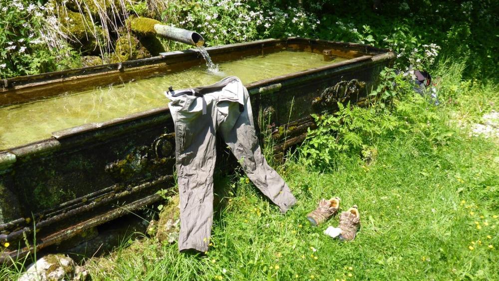 Hitzesommer – oder der etwas andere Tourbericht....... Ich habe überlegt, ob ich diesen Bericht überhaupt einstellen soll, hat er doch kaum etwas mit einer klassischen UL-Tour zu tun. Schließlich wollte ich euch jedoch meine Erfahrungen mit dem Hitzesommer dieses Jahres nicht vorenthalten und stelle mal eine Kurzbeschreibung meiner Erfahrungen und Erlebnisse auf dieser Tour vor. Bereits im letzten Herbst habe ich mit den Vorbereitungen für den Hike des Hauptwanderweges 9 – Heuberg-Allgäu-Weg – des Schwäbischen Albvereins, begonnen. Es soll 185 km von Spaichingen bei Tuttlingen zum Schwarzen Grat bei Kempten im Allgäu gehen. Ich habe Karten beschafft, den GPX-Track heruntergeladen, gefühlte hundert Mal auf Google Earth die Strecke verfolgt, potentielle Übernachtungsplätze festgelegt, an der Ausrüstung gefeilt usw. usw. Im Juni 2018 habe ich ein Zeitfenster ausgemacht, das mir zwei Wochen Urlaub ermöglicht. Die Wetteraussichten kurz vor Tourstart sind grandios (auf den ersten Blick). Temperaturen > 30°, schwül und gegen Abend schwere Gewitter. War schon das Frühjahr viel zu warm, scheint mich eine „heiße Tour“ zu erwarten. Verschieben ist nicht, also bedarf es einen genauen Blick auf die Ausrüstung, die mitgenommen werden soll. Das ist nicht die Ausrüstung, die ich mitgenommen, sondern die Ausrüstung die ich zu Hause gelassen habe ! Also mal sehen. Daunenjacke ? Bei über 30° jeden Tag und Schwüle ? Raus damit ! Windjacke ? Meine FroggToggs-Regenjacke erfüllt den gleichen Zweck. Raus damit ! Handschuhe und Mütze ? Raus damit ! Klymit-Airbeam mit Pumpe für meinen Huckepack ? Ich falte meine EVA und schon habe ich ein Rückenpolster. Also raus damit ! Topf, Gasbrenner, Löffel und Feuerzeug ? Die Tour führt (i.d.R.) durch dicht bewohnte Gegenden und 40 km am Bodensee entlang. Also raus damit ! Schließlich lande ich bei 4600 Gramm Base. Klasse ! Fast UL. Ich grüble weiter über meine Ausrüstung, beschließe, die Sonnenschutzcreme mit LSF 30 gegen Creme mit Lichtschutzfaktor 50+ und genauso meinen Lippenschutz mit einem Stift mit LSF 30 auszutauschen. Dann geht es endlich los. Schon am ersten Tag, erlebe ich einen Vorgeschmack auf die folgenden Tage. Beim Aufstieg auf den Dreifaltigkeitsberg brennt die Sonne schon Morgens glühend heiß vom Himmel. In kürzester Zeit bin ich in Schweiß gebadet. Es geht viele Kilometer auf Schotter- und Teerwegen durch den Wald in praller Sonne. Die gute Nachricht: Das Insektensterben fällt nicht so schlimm aus wie gedacht ! Ich kann beruhigend mitteilen: Es gibt noch genug Bremsen. Auf den Schotter- und Teerwegen wehre ich mich stundenlang gegen Bremsen. Besonders lästig sind die großen Pferdebremsen, die es sich vor dem Anflug auf meinen Körper, auf der grauen Unterseite meines Swing Lite-Flex Schirmes bequem machen und sich zum Angriff sammeln. Die folgenden Tage werden mich diese lästigen Viecher bei jedem Feuchtgebiet, bei jedem Gang durch eine Viehweide (ganz lästig, wenn noch Kühe auf der Weide sind), bei jedem Gang auf sonnenbeschienenen Schotterwegen piesacken. Leider führt der HW 9 nur für sehr kurze Zeit auf naturbelassenen Wegen durch die Gegend. Meistens sind Schotterwege, ja tagelang hauptsächlich Teerwege zu finden. Die Sonneneinstrahlung auf die Wege reflektiert die Hitze zurück an den Körper, so dass auch der Lite-Flex-Schirm an seine Grenzen stößt. Nach wenigen Stunden gehen, bin ich fix und alle. Gottseidank habe ich meine Ausrüstung rigoros abgespeckt. Ich wage es nicht mir auszumalen, was für eine Tortur es wäre, mit 15 oder mehr Kilogramm durch diese Hitze zu schleichen. Also Daumen hoch für UL ! Am ersten Tag, nach 31 Kilometern, erreiche ich, von der Hitze ziemlich zermürbt, meinen Übernachtungsplatz im Wald bei Neuhausen ob Eck. Dachte ich noch auf den letzten Kilometern, dass das Brennen an der Innenseite der Oberschenkel eben vom Schweiß her rührt, werde ich beim Ausziehen meiner Wanderklamotten unangenehm überrascht. Durch die starke Schweißbildung und Reibung hat sich der Stoff meiner Decathlon-Wanderhose im Schritt aufgelöst und auf einem handtellergroßem Stück große Löcher und aufgezwirbelte Fäden gebildet. Es haben sich, trotz eincremen zu Beginn der Tour, an meinen Oberschenkeln blutige Scheuerstellen gebildet, die jetzt wie die Hölle brennen. An eine Reparatur meiner Hose ist nicht zu denken. „Aaargh ! Das ist schon das zweite Mal, dass mich so eine Billighose im Stich lässt. Das war das letzte Mal, dass ich so einen Sch..... kaufe !“ fluche ich vor mich hin. Jetzt wird’s spannend. Tour-Abbruch oder nicht, ist jetzt die Frage. Ich starte mein Smartphone (habe ich je behauptet, dass man so etwas nicht braucht ? hüstel, hüstel ) und suche das nächst gelegene Sportgeschäft. Na Klasse ! 40 Kilometer entfernt in Überlingen, wird der nächste Laden angezeigt. Belämmert sitze ich auf dem Waldboden vor meinem Contrail und überlege, was ich machen soll. „Ich könnte ja die Scheuerstellen abkleben und vorsichtig 20 Kilometer nach Stockach gehen, falls die Hose so lange durchhält. Vielleicht gibt’s dort einen ähnlichen Laden, der Hosen verkauft. Wenn es nicht klappt und die Hose vollends auseinanderfällt, kann ich noch meine Regenhose anziehen und mit dem Bus von Stockach aus nach Hause fahren“ „Nein, das kommt doch überhaupt nicht in Frage ! Ich werde morgen mein Glück versuchen und nach Stockach gehen. Falls es noch reicht, sogar nach Überlingen und mir dort eine neue Hose kaufen“. sage ich zu mir und mache mich für die Nacht fertig. Der Himmel ist bedeckt und es ist unerträglich schwül. Es tröpfelt für ein paar Minuten vor sich hin und schon habe ich das nächste Problem an der Backe. Es ist nicht daran zu denken, die Nachtklamotten anzuziehen. Sobald ich meine lange Seidenunterhose und das Nachtshirt anziehe, rinnt mir der Schweiß in Strömen über den Körper. Im Contrail ist es fast nicht auszuhalten. Bis 02.00 Uhr in der Nacht 