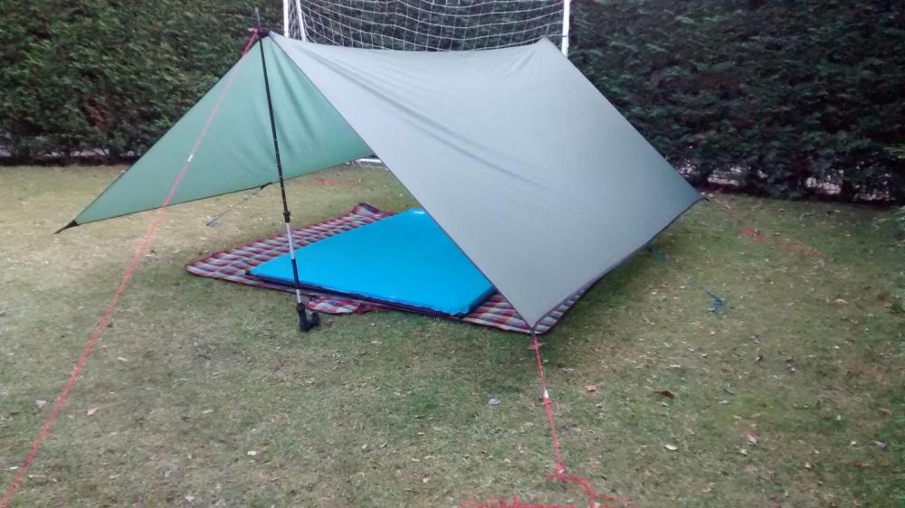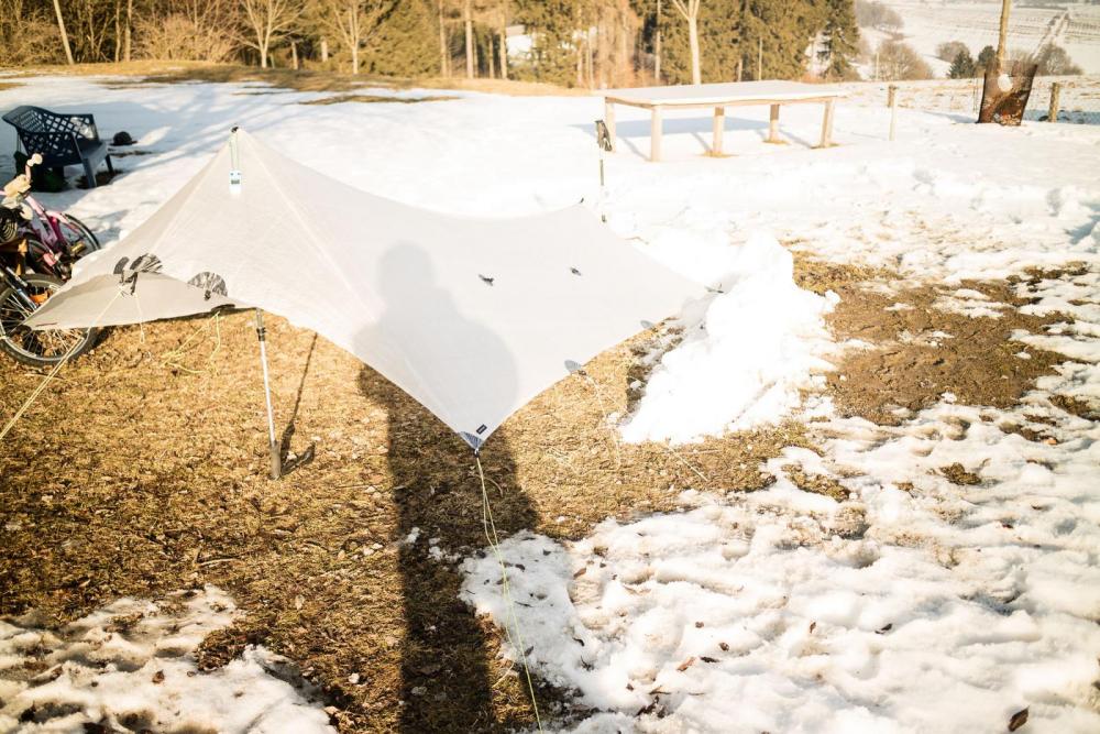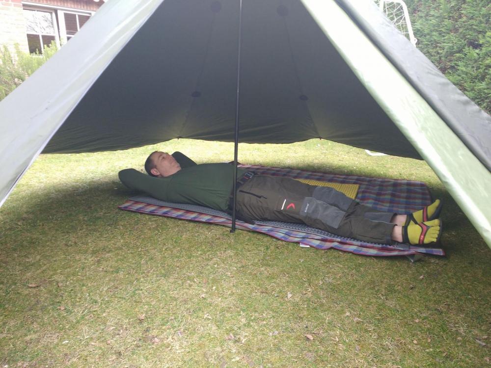 Bis jetzt… In der letzten Zeit kamen fuer uns beide nur zwei Unterkuenfte zum Einsatz: Der Laufbursche CubenTanzpalast oder ein 3×3 Tarp. Idee und Planung… Ein Unterschlupf, der ein wenig mehr Privatsphaere/Wetterschutz bietet und vielleicht auch noch ein wenig groesser als der Tanzpalast ist, waere ja auch mal nett, oder? Die ersten Gedanken kreisen um eine asymmetrische Pyramiden-Form (es existieren jetzt schon diverse verschiedene Papiermodelle im Massstab 1:10!), aber irgendwie…. Erst ein Bild eines Zeltes in Tipi/Lavvu-Form bringt unsere Planungen dann ein Stueckchen weiter: Die Suchmaschine unseres Vertrauens spuckt in ihrer Bildersuche dann doch einige huebsche Anschauungsobjekte zum Vorschein. Nach kurzer Diskussion beschliessen wir, das es nen Lavvu wird! Mit Bleistift, Zirkel, Geodreieck und Lineal entsteht dann fix die erste Zeichnung. Aber wie lang sind denn jetzt nun die Seiten???? SYN(), COS() und TAN() sind bei uns beiden doch schon ein paar Jaehrchen her. Wenn das mal kein Grund ist, unsere angestaubten Kenntnisse mal ein wenig aufzufrischen! Die 2m Stangehoehe der Discounter-Tarp-Stange und Ausnutzung fast der gesamten Stoffbreite sind die Grundlagen, anhand derer wir die Abmessungen erraten… Materialauswahl… Zum Glueck finden sich in unserer Grabbelkiste dann so einige „Zutaten“, um einen Prototypen zu wagen, (fast) ohne Material ordern zu muessen. einige laufende Meter SilPoly (90g/qm) ein wenig PU-Zeltboden (120g/qm?) 15mm Gurtband Aquaquard 3C Reissverschluss 2mm PE Schnur Kabelbinder 2 Tankas Stahlstange vom Tarp eines Discounters …and Cut! Benoetigt eine solche Zeltform eigentlich einen Cat-Cut? Sicher sind wir uns nicht, aber versuchen wollen wir es dann doch – kurzerhand dann Pi-mal-Daumen 2cm pro laufenden Meter Stofflaenge (aufgerundet auf den naechsten vollen cm) beschlossen und einen „Schablonenstreifen“ basteltn, um es beim Zuschneiden dann leichter zu haben. Kennt von Euch noch wer die Endlospapierstreifen aus den Nadeldruckern? Hier ist es Papier von einer Rolle – danke Ikea! Nun heisst es, auf dem Boden herumkriechen um die Stoffbahnen anzuzeichnen und auszuschneiden…. Wohl dem, der einen grossen Schneidetisch hat! Die Form der Luefter macht uns noch ein wenig Kopfzerbrechen, aber irgendwann entscheiden wir, das wir zwei gegenueberliegende Bahnen im oberen Bereich gerade abschneiden und die Kante dann um-, sowie breitere Stoffstuecken (die spaeteren Luefter) annaehen. Hat funktioniert, auch wenn es nicht perfekt aussieht… …naehen… oder: Doppelte Kappnaehte? Was ist das? Da wir beide bis zu diesem Zeitpunkt keinerlei Erfahrung mit dem Naehen von Kappnaehten haben, naehen wir erst mal eine kleine Probenaht auf einem Reststueck…. Sieht doch ganz gut aus, also wagen wir uns an die grossen „Lappen“! So ein Haufen Stoff ist halt doch was anderes als nen handlicher Rucksack – mehr als einmal verirrt sich die Naehnadel auf Stoffstuecke, die eigentlich gar nicht dafuer vorgesehen sind. Besonders als zum Schluss die Verstaerkungen aufgenaeht werden. Und warum sind die beiden zuletzt geschnittenen Bahnen eigentlich auf je einer Seite 12cm zu kurz? Die vielfarbigen Flueche geben wir hier jetzt nicht wieder! Vom Naehen gibt es keine Photos zu sehen – Auch nicht auf Nachfrage! ULTFWT Kurz bevor es zum Wintertreffen des Forums geht, naehen wir noch eben schnell die letzten Verstaerkungen und Abspannpunkte an. Schliesslich soll uns das LavViR als Unterkunft dienen. Im frostigen Kaltenwestheimer Wind dann der Probeaufbau: Mit Muehe und Not klopfen wir rundherum die Heringe in den hartgefrorenen Boden, dann schnell die Stange aufstellen, aber irgendwie will das nicht so richtig, also zupfen wir ein paar Heringe. Zweiter Versuch mit stehender Stange und helfenden Haenden! Irgendwie verhaelt sich unsere Unterkunft in spe aber sehr stoerrisch – der Blick ins Innere gibt Gewissheit: Die Tarpstange der Muelheimer Discounter Brueder praesentiert sich uns stolz in V-Form. Also packen wir alles wieder zusammen, bauen den Tanzpalast wieder auf und verschieben den Aufbau auf spaeter… …steht…. Nach kurzer Recherche im Netz bestellen wir dann 2x 1 Meter 20mm Carbon-Rohr, ein passendes carbon-Stueck als Steckung, der Baumarkt steuert zwei Endstopfen bei… (ein wenig ueberdimensioniert – insgesamt 198g) Fazit Rechnen statt schaetzen! Vorm Schneiden lieber mal nachmessen… 4 Haende sind beim Naehen doch echt von Vorteil Gekaufte Tarpstangen sind auch nicht mehr das, was sie mal waren dicke Nadeln hinterlassen grosse Löcher im SilPoly! Cat-Cut – an den langen Naehten weniger, an den Unterkanten wenigstens etwas! Die naechste Stoffbestellung geht jetzt raus – das ganze war ja als Prototyp gedacht!