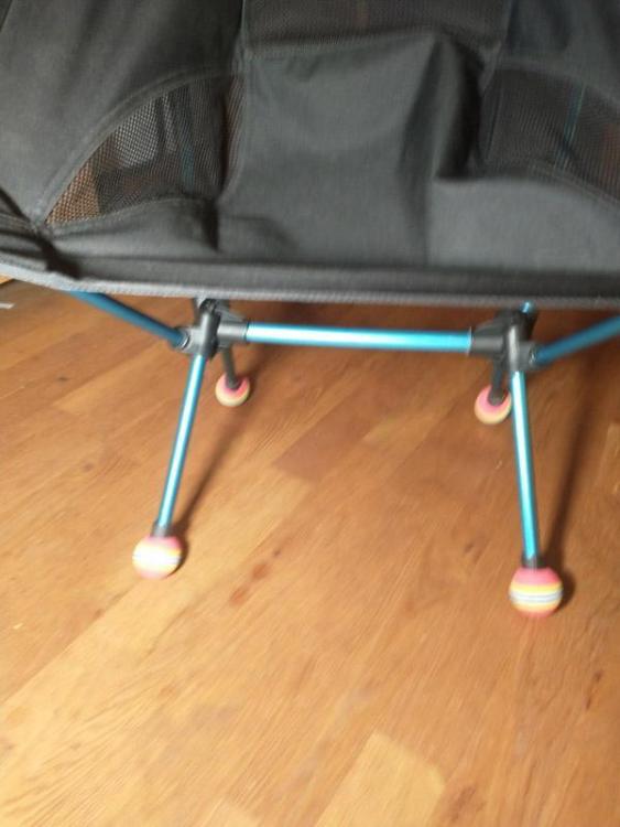 Der größere Sunset Chair hat ja dickere Rohre, da ist das kein Problem, aber beim Chair Zero und dem Chair One sehr wohl in weichem Grund. Zuletzt noch in NL Friesland auf Torfgrund erlebt, wo ich den Chair One als "Gästestuhl" bei hatte. Klar den Tip mit den angebohrten Tennisbällen und das entsprechende Set von Helinox selber kenne ich, aber da ist mir das Packmaß zu groß und deutlich zu schwer, mal davon abgesehen, daß ich einen VK von knapp 30 € auch deutlich zu viel dafür finde. Die Tage bekam ich dann von einem Kunden von mir, den Tip Golf-Schaumstoff-Übungsbälle zu verwenden, er hat das bei seinem Chair Zero L verwirklicht, siehe nächstes Bild Seinem Tip folgend habe ich mir solche Bälle besorgt In die Ständer-Bohrmaschine eingespannt und mit 19 mm gebohrt (habe die org Gummistopfen an den Füßen mit 22 mm gemessen) Die Bälle sitzen recht stramm drauf, würde ich es nochmal machen, würde ich evtl mit 18 stratt 19 mm bohren Klasse Tip von ihm...