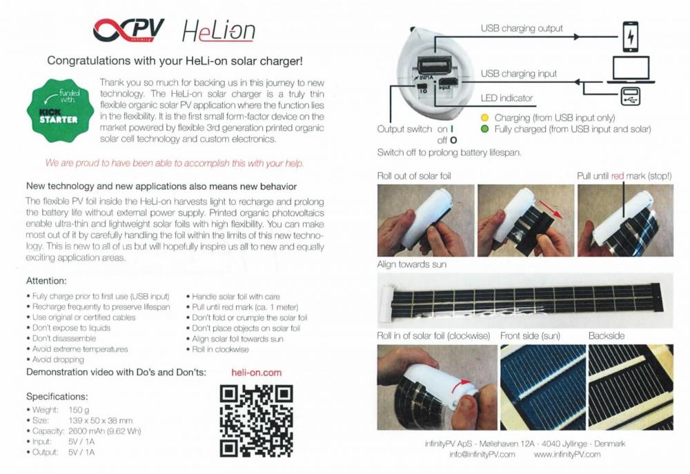 Hallo Leute, heute war das Ergebnis des Kickstarter-Projekts „HeLi-on - The World's Most Compact Solar Charger“ in der Post. Meine ersten Eindrücke sind positiv bis neutral: Es liegt gut und kompakt in der Hand. Der Inhalt ist gut geschützt. Es ist größer, als in der ursprünglichen Kampagne sichtbar. Es ist schwerer, als damals spezifiziert: 140 g statt 103 g. Es ist ordentlich, aber nicht überragend verarbeitet. Z. B. liegt der in der ursprünglichen Spezifikation nicht vorhandene Ein-/Ausschalter ungünstig am Rand einer Aussparung. Die Verbindungskanten der Gehäuseteile sind nicht überall flächenbündig. Die Grifflasche ist nicht, wie auf dem Projektvideo zu sehen, ein vorstehender Teil des gedruckten Panels, sondern ein GFK-Stift über die volle Breite, der mit Textilklebeband in Industriequalität (in meinem Fall: leicht schief) auf das Panel-Ende geklebt wurde. Das verhindert das vollständige Einrollen, erhöht aber auch das Gewicht. Das ausgerollte Panel misst 980 × 95 mm² = 0,093 m². Da das Panel transparent ist, werde ich unter anderem testen, ob die Leistung höher ausfällt, wenn ich es auf einer mitgeführten Windschutzscheibenmatte auslege. Die Anleitung geht nicht auf das Ladeverhalten ein. In der ursprünglichen Beschreibung online steht, dass man das angeschlossene Gerät wahlweise (Panel eingerollt) vom eingebauten 2600er-Akku laden könne oder (Panel ausgerollt) „von der Sonne“. Ob das Panel bei ausreichender Einstrahlung tatsächlich >500 mA liefert und direkt an den USB-Ausgang durchgeschleift ist, konnte ich noch nicht testen. Aber mit diesem Post ist der Anfang gemacht, lieber @TappsiTörtel. Und bevor jemand fragt: Nein, der Kugelschreiber war nicht dabei, der dient nur zum Größenvergleich.