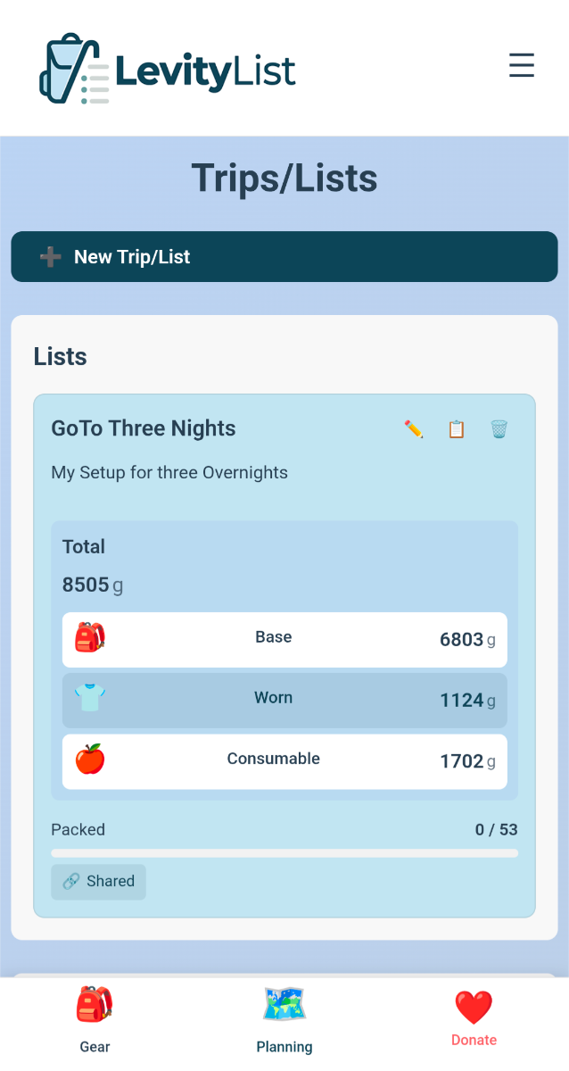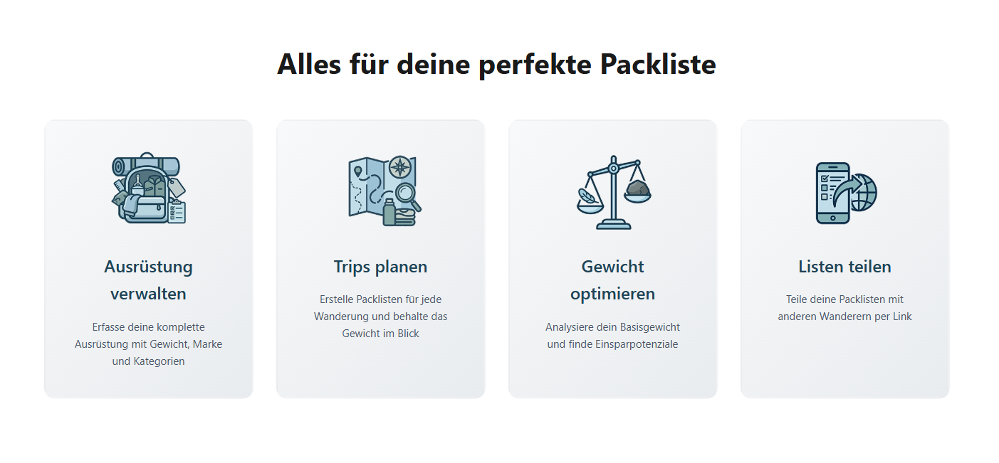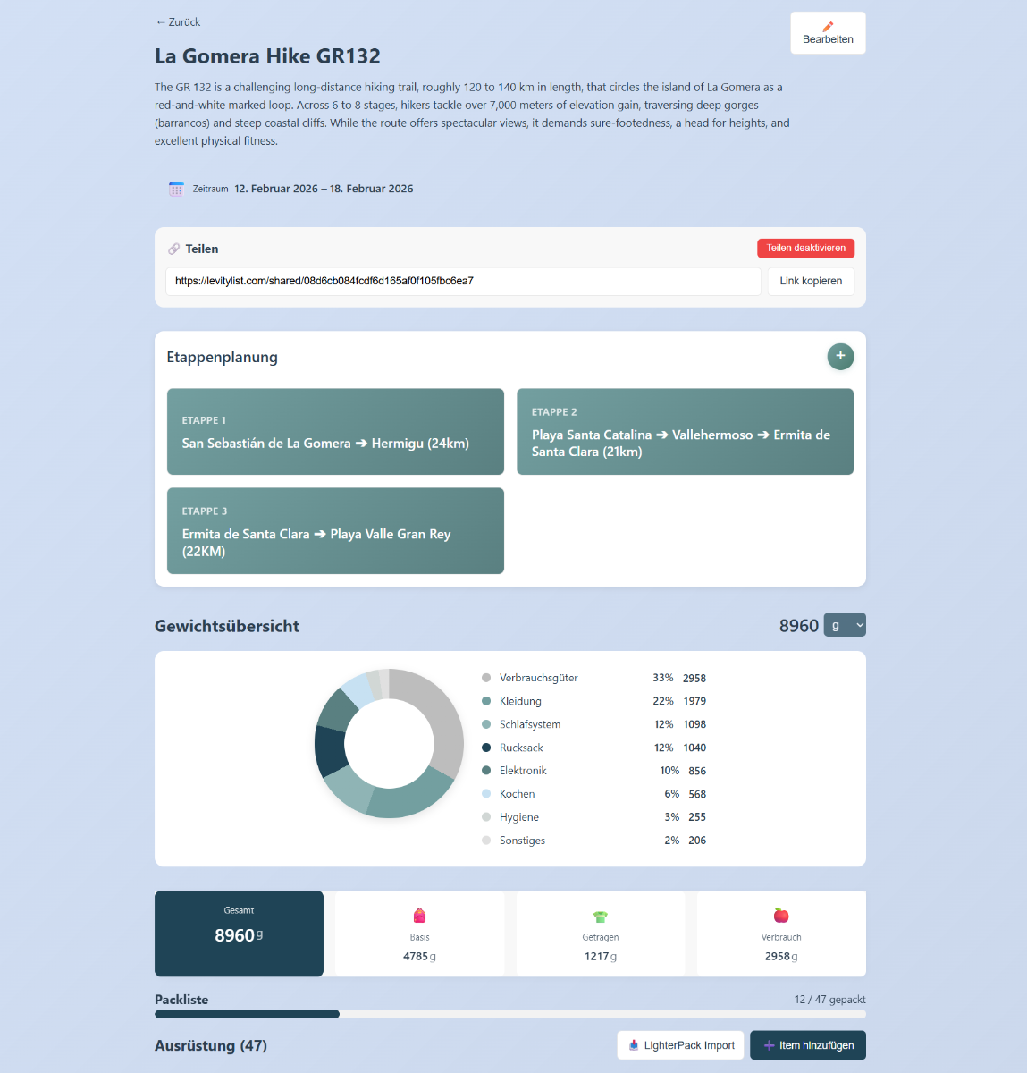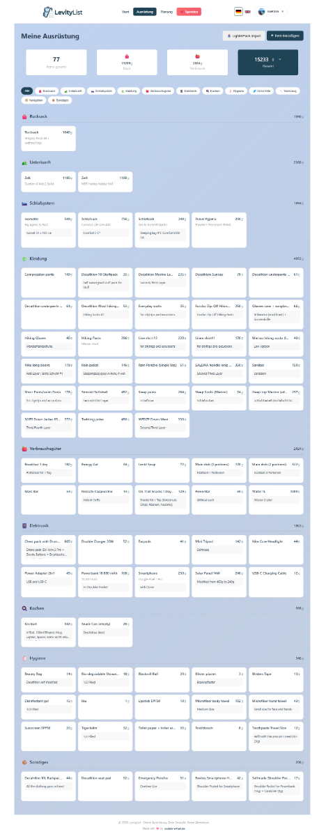 maKSim85 Geschrieben vor 1 Stunde Geschrieben vor 1 Stunde Hallo liebe Wander- und UL-Community, für meine eigenen Bedürfnisse habe ich quasi ein LighterPack 2.0 gebaut! Nach und nach sind Funktionen dazu gekommen, die ich nun einfach teilen möchte, weil ich mir sicher bin, dass es doch auch dem ein oder anderen gefallen wird. Und keine Sorge: Es ist absolut 100 % kostenlos! Hier einmal mein Komoot Profil falls jemand denkt ich bin/war gar kein Wanderfreak :) https://www.komoot.com/de-de/user/398067465804 Nun bin ich Papa von einer 10 Monate alten Tochter und erstmal an einem Ort gebunden. Das Wandern kommt leider deutlich zu kurz. Ich habe aber die Zeit genutzt und die App eigentlich entwickelt, weil ich über viele Jahre selbst unglaublich viel wandern war und für das Wandern total gelebt habe. Mein Pensum ist dabei wohl einfach ein ganzes Stück größer als das, was man so als normal bezeichnet gewesen. Den Three Passes Trek in Nepal in 6 Tagen zum Beispiel. Deswegen habe ich zu den Standard-GPS-Daten, die man so findet, quasi immer noch weiter recherchiert und mir halt meine eigenen Notizen gemacht. Ich wollte ja einfach genau wissen, wo es noch Wasser gibt oder wie weit ich heute praktisch noch laufen kann, bevor ich mein Zelt aufbaue. Gleichzeitig habe ich mein Equipment für die Tour bisher mit LighterPack erfasst. Nun ist LighterPack ja aber wohl deutlich in die Jahre gekommen und ich wollte einfach etwas Modernes, Mobiles und mit ein paar mehr Funktionen. Aus genau diesem Grund habe ich mich nun entschlossen, einfach ein Tool zu bauen, das ich für die Planung von echten Mehrtagestouren absolut benötige. Ein LighterPack 2.0 quasi! Equipment verwalten, Packlisten/Wanderungen erstellen, Etappenplanung (Notizen) und Checkliste! So ist LevityList entstanden - https://levitylist.com/ Ich würde mich über euer Feedback freuen, registriere dich, teste es und ich freue mich über ehrliches Feedback. Kannst du dir vorstellen LevityList aktiv zu nutzen? Wie findest du die Funktionen? Wie ist die UX? Vermisst du etwas? So sieht eine geteilte Liste/Wanderung aus: https://levitylist.com/shared/08d6cb084fcdf6d165af0f105fbc6ea7 LevityList - Features Übersicht Die ultimative Packlisten-App für Outdoor-Abenteurer. Organisiere deine Ausrüstung, plane deine Trips und optimiere dein Gewicht. 📦 Ausrüstungsverwaltung - LighterPack Import: Importiere deine bestehenden LighterPack-Listen mit einem Klick - Digitale Gear-Datenbank: Verwalte deine gesamte Outdoor-Ausrüstung an einem Ort - Smart Kategorien: 12 vordefinierte Kategorien mit Emojis für schnelle Übersicht - Gewichts-Tracking: Automatische Berechnung von Basis-, Verbrauchs- und Gesamtgewicht - Flexible Einheiten: Wechsel zwischen g, kg, oz und lb - Multi-Select: Wähle mehrere Items gleichzeitig aus und füge sie zu Listen hinzu - Detaillierte Item-Infos: Speichere Name, Marke, Modell, Gewicht, Preis, Kaufdatum und Notizen - 🥾 Trip-Planung - Unbegrenzte Trips & Listen: Erstelle so viele Packlisten wie du möchtest - Smart Organisation: Automatische Sortierung nach geplanten, vergangenen und zeitlosen Listen - Trip-Details: Speichere Datum, Location, Dauer, - Gewichtsübersicht: Sehe auf einen Blick Basis-, Worn- und Consumable-Gewicht - Pack-Fortschritt: Visueller Fortschrittsbalken zeigt was bereits gepackt ist - Trip duplizieren: Erstelle Kopien deiner bewährten Listen für neue Touren - 📋 Packlisten-Management - Interaktive Packliste: Hake ab was bereits im Rucksack ist - Smart Kategorisierung: Items automatisch nach Kategorien gruppiert und nach Gewicht sortiert - Gewichtsverteilung: Visueller Pie-Chart zeigt wo dein Gewicht steckt - Mengen anpassen: Ändere die Anzahl von Items direkt in der Liste - Worn-Tracking: Markiere getragene Kleidung separat vom Basisgewicht - Items hinzufügen: Wähle aus deinem Inventar oder importiere direkt aus LighterPack - Liste teilen: Generiere einen teilbaren Link für deine Packliste - Etappen-Notizen: Speichere wichtige Infos zu deinem Trip 🌐 Listen teilen LevityList - Pack Smart. Travel Light. mtb_squirrel reagierte darauf 1