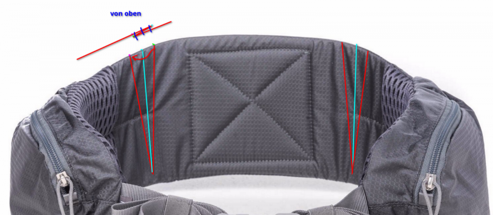 ULgeher Geschrieben 21. November 2022 Geschrieben 21. November 2022 (bearbeitet) vor 10 Stunden schrieb Mia im Zelt: Abgesehen davon sind bei diesem Modell die Schultergurte gerade angenäht. Das hat ja schon beim HMG nicht gepasst. Ich würde das aber nicht generell als Ausschlusskriterium anwenden: Wenn der Rucksack exakt deine Rückenlänge hat, und die Riemen fast auf Schulterhöhe ansetzen (so wählt man einen Rucksack ohne Lastkontrollriemen ja aus), dann kann ich mir vorstellen, dass bei deiner Schulterform der Riemen auf der Halsseite einschneidet. Wenn die Riemen aber genügend unter Schulterhöhe angenäht sind, sollte es keine Rolle mehr spielen, wie sie angenäht sind. In beiden Fällen ergibt sich derselbe Verlauf über der Schulter. Die Lastkontrollriemen halten den Rucksack dann nahe am Rücken. Ich habe hier mal eine Skizzer versucht: violett = schräge Naht, rot = gerade Naht. Bei Flex Cap wirst du mit dem S/M z.B. eh die Lastkontrollriemen benötigen. Bei einem nur auf Leichtigkeit getrimmten Rucksack, werden die Riemen gerne weggelassen, dann muss die Rückenlänge aber exakt stimmen. Dann kann das Problem mit dem Einschneiden aber auch mit der schrägen Naht auftreten. Dann hilft wohl nur ein weicher Schultergurt. Und die Gurte sollten auf der Innenseite keinesfalls abgesteppt sein, das produziert scharfe Kanten. vor 10 Stunden schrieb Mia im Zelt: So ein durchbrochener Hüftgurt klingt tatsächlich sinnvoll. Leider ist dies selten bei Rucksäcken. Bisher habe ich dies nur beim Lightwave Ultrahike 60 gesehen. Aber der ist ausverkauft und mit 65 Liter Volumen schon wieder eher zu groß. Wobei selbst die kleinere Größe mit einer Rückenlänge von 50cm angegeben wird. Im Grunde reicht es, dass der Hüftgurt in der Mitte weich ist. Das kann z.B. dadurch erzielt werden, dass das Verstärkungsmaterial in der Mitte eine Aussparung hat - das ist von aussen nicht sichtbar, hat aber diesselbe Wirkung, ohne die zusätzlichen Nähte. Bearbeitet 21. November 2022 von ULgeher Mia im Zelt reagierte darauf 1